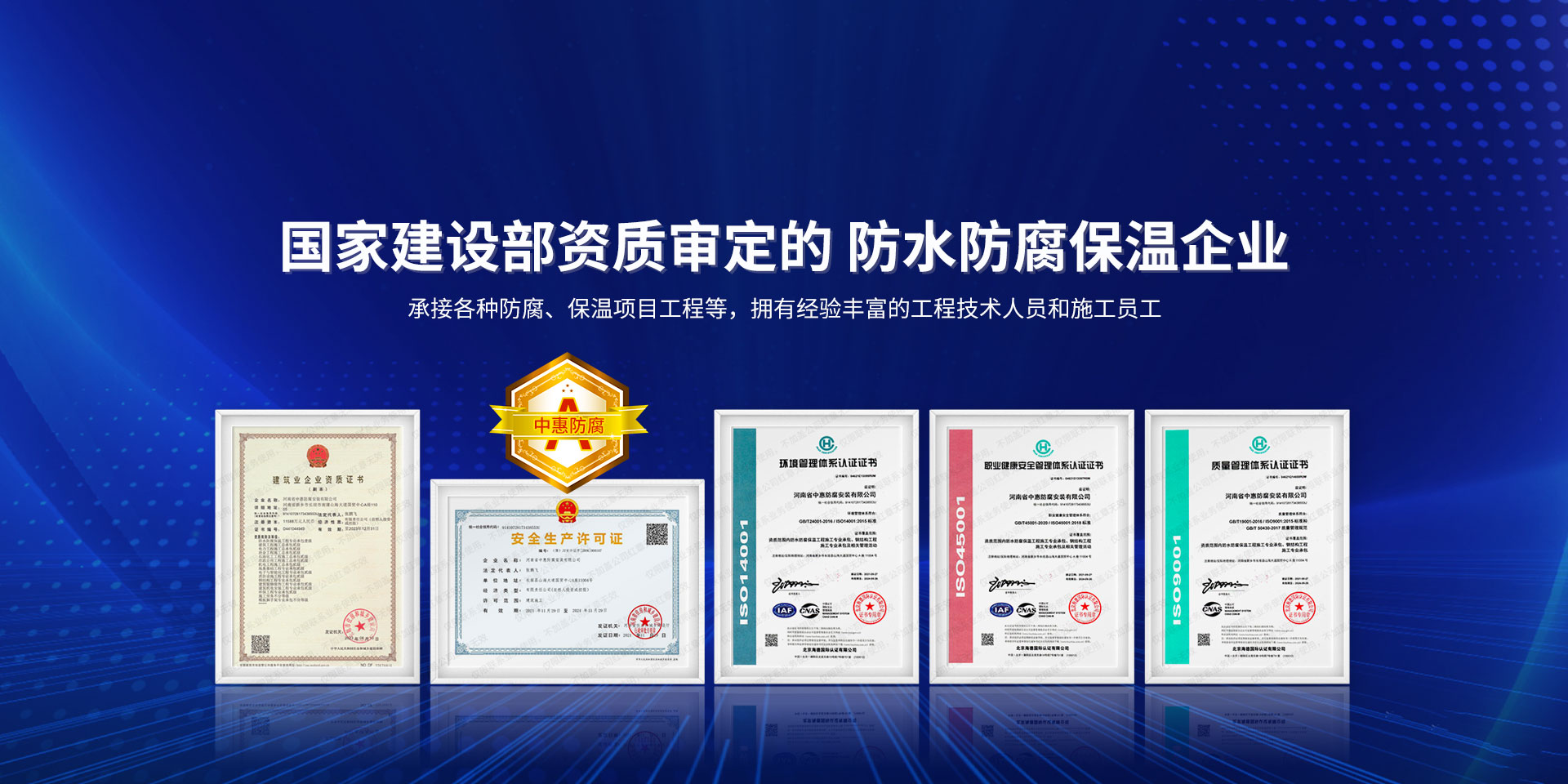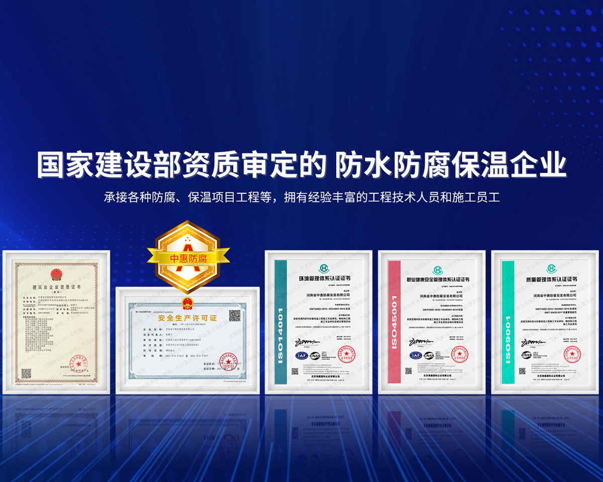 公司經營范圍:防水防腐保溫工程;消防設施工程;建筑裝修裝飾工程;建筑機電安裝工程;電力工程;建筑工程;石油化工工程;工業清洗工程;油罐清洗工程;鋼結構工程;環保工程;模板腳手架工程;電纜防火封堵、防污閃噴涂、外墻外保溫工程;各類施工勞務作業;設備維修、船舶鉚焊、涂裝;電力工程材料、建材、防水材料、防火材料、防腐保溫材料銷售,并相繼通過了GB/T19001-2008idtISO9001:2008GB/T50430-2007質量管理體系認證證書。GB/T24001-2004idtISO14001:2004環境管理體系認證證書。GB/T28001-2011idtOHSAS18001:2007職業健康安全管理體系認證證書。公司是中國防腐蝕于防護協會、中國施工企業管理協會、電力協會和中國鋼結構防水協會會員單位?! 」镜慕洜I業務涵蓋了石油、化工、電力、冶金、煤炭、船舶、國防、燃氣、水利、環保、交通運輸、航空及國防軍工和輕紡市政等行業的防腐保溫絕熱設備。鋼結構安裝、防火、防水、金屬噴鍍、聚脲噴繪、陰極保護、防滲透堵漏、玻璃鋼及各種磚版材料襯里、橡膠襯里、煙氣硫和耐酸溶劑腐蝕等工程施工。公司連續十年榮獲“省市先進施工企業”“安全生產先進單位”“重合同,守信用企業”和“AA***資質企業”的稱號。2000年被命名為市級文明單位,2002年被國家工商行政管理局命名為“重合同,守信用的企業”、被中國工業防腐蝕技術協會命名為“防腐蝕企業,能源節約及環境保護領域有豐富的經驗和***的業績。工程一次交驗合格率100%。其中攀枝花鋼鐵公司煉鐵廠四號高爐及熱風爐防腐工程、上海寶鋼公司煤氣柜防腐工程、撫順石油一廠裝置防腐項目、齊魯石化公司稀烴廠高塔防腐工程、吉林化學工業公司煉油廠油罐防腐工程、天津石化熱電廠六號爐頂棚聯絡管保溫工程、大慶油田(太倉)力神泵業工程、中國化學工程第十一建設工程、中原油田勘探局工程、中國石化銷售有限公司華北分部、魯皖輸油管道工程、貴州開磷息烽合成氨工程、陜西黃陵煤化工程、中國石油天然氣西部管道塔里木輸油工程、邯鋼集團邯寶鋼鐵公司煉鐵工程、德州供電工程、吉寶(南通)船廠工程,偃師華潤熱力工程、鄭州熱力總公司。 河南省中惠防腐安裝有限公司愿以豐富的施工經驗,***的技術,***的設備,***的管理,***的服務,竭誠為國內外廣大的用戶提供***滿意、******的工程作品?! ∥夜驹概c國內外同仁一道,團結協作,共同推進防腐蝕行業發展! 公司地址:河南省長垣縣建設路北段360號 固定電話:0373-8866488 郵編:453400 網址:http://www_zhff_com_cn.bsjbashi.com